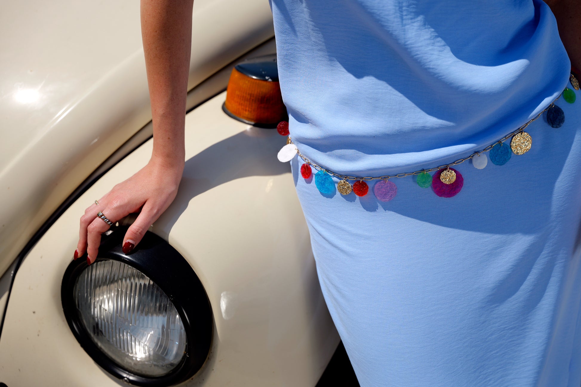 Collar cadena dorada con piezas en círculo de colores.